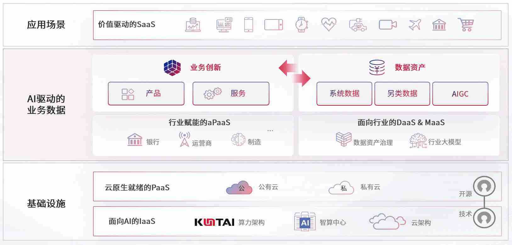 数字时代,,围绕企业数字化转型的关键要素,,PA旗舰厅数码开创性的提出数云融合战略和技术体系框架,,,着力在云原生、、数字原生、、、AI原生和信创产业上架构产品和服务能力,,为处在不同数字化转型阶段的快消零售、、、汽车、、金融、、医疗、、、、政企、、、、教育、、、、运营商等行业客户提供泛在的敏捷IT能力和融合的数据驱动能力,,,,构建跨界融合创新的数字业务场景和新业务模式,,,,助力企业级客户建立面向未来的核心能力和竞争优势,,全面推动社会的数字化、、智能化转型升级。。。