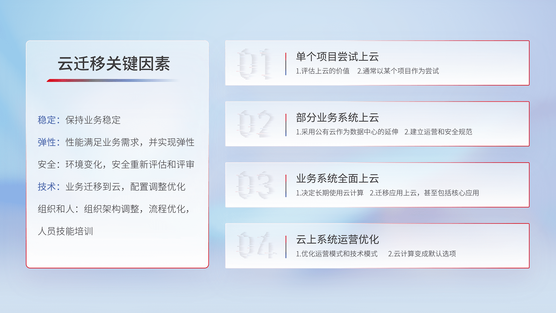 结合实际业务,,,,从规划设计、、、、云平台选型、、云原生改造、、数据迁移、、、集成交付,,迁移全过程为客户识别最佳上云路径,,做好风险识别管理,,,,设计网络架构、、身份权限、、、安全审计合规、、、操作审计、、、日志审计、、、、监控告警策略、、、、多站点容灾设计等,,,,对云上基础设施进行整体规划,,提升IT治理水平,,以满足弹性、、高可用、、高性能的需求。。。。