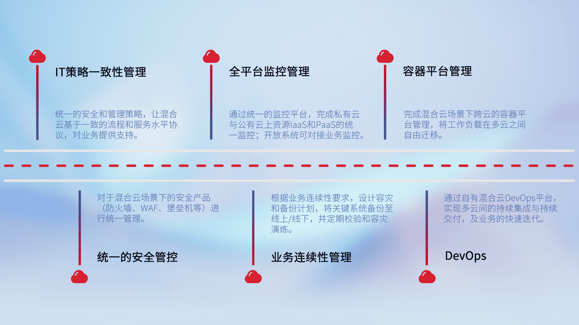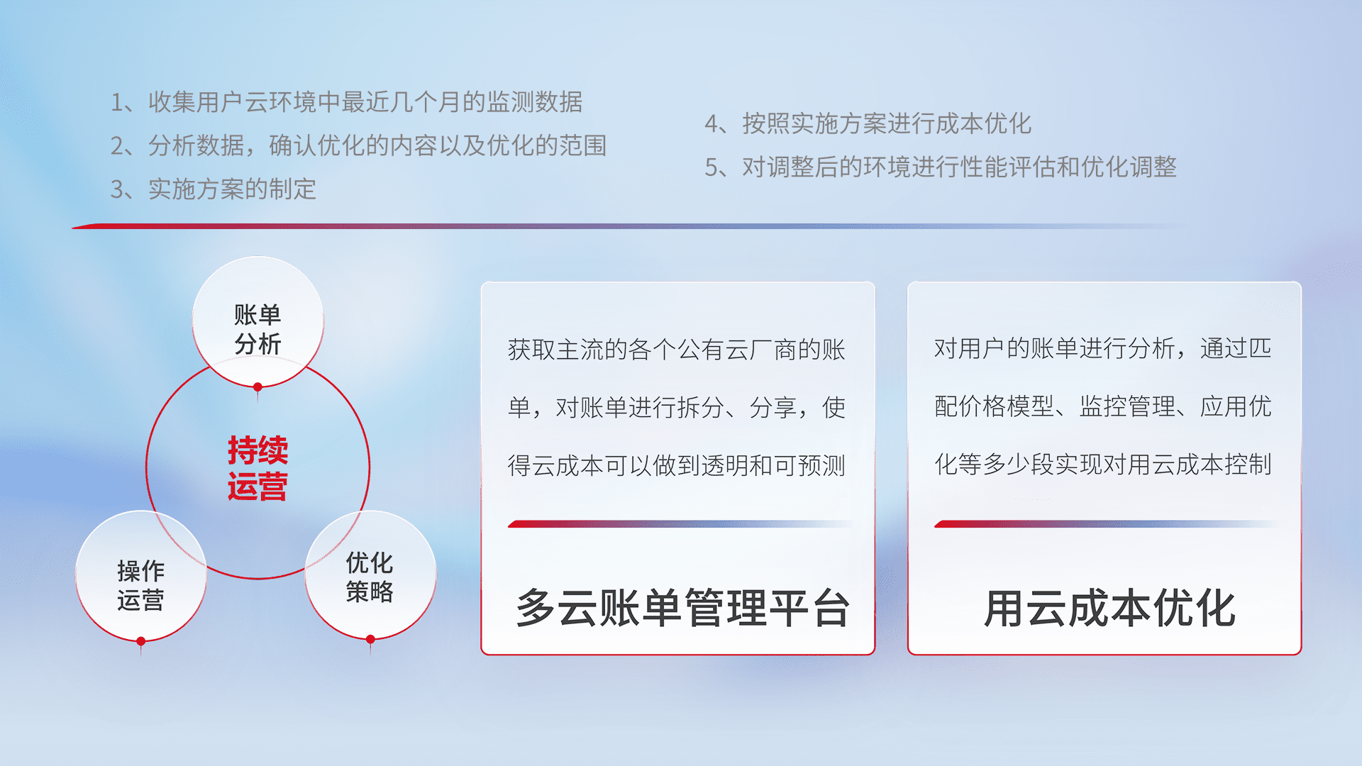 通过多云纳管,,以统一的资源数据模型把客户的云资源进行抽象和封装,,,进而实现对多云资源的统一操作,,保障云资源管理的可靠性、、、、稳定性与可用性。。。量身定制化运维内容,,,,配置、、、、开发运维、、补丁管理、、、、备份、、监控、、认证和访问管理、、审计和日常巡检等,,保障在用云过程中的可靠度,,稳定度以及高可用率。。。。