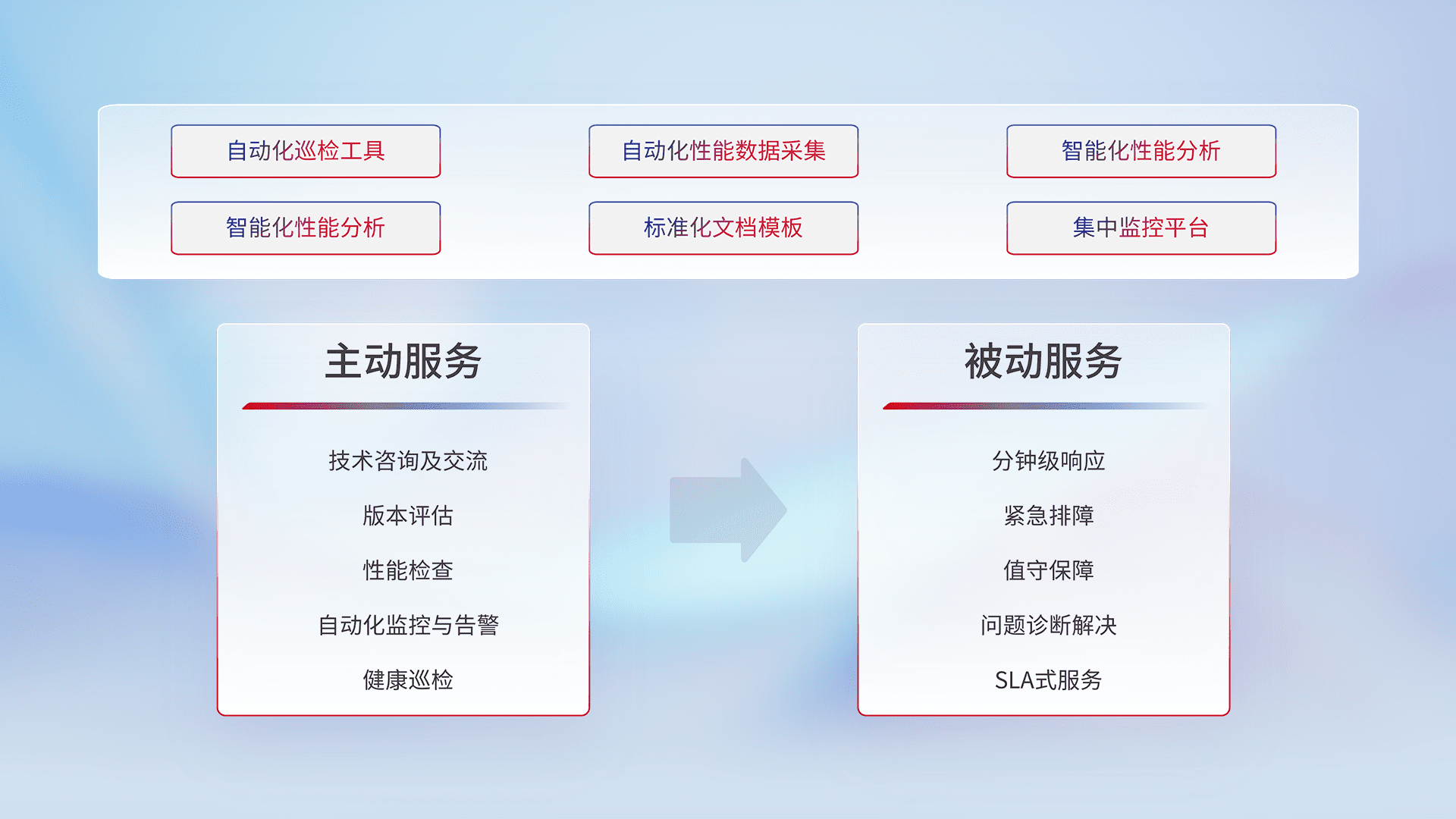 智能化工具和标准化文档,,保障服务质量,,提供主动服务(包含技术咨询、、版本评估、、性能检查、、、、自动化监控与告警、、健康巡检)和被动服务包含(分钟级响应、、、紧急排障、、值守保障、、问题诊断解决、、、SLA服务)。。
